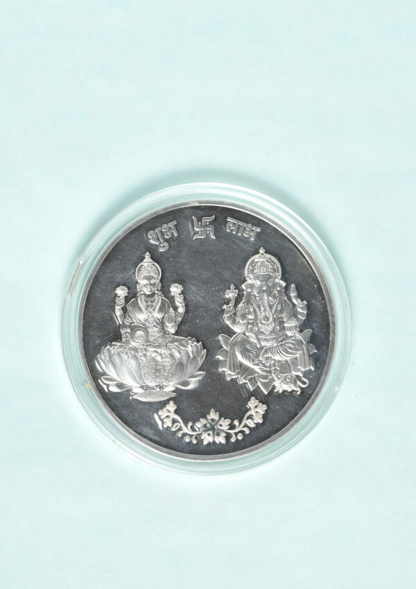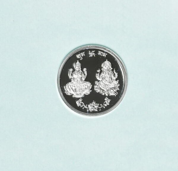 Swarnchandrika silver coins are in 999 purity featuring Ganesh-Laxmi on the front side and symbol of Om in between a lotus flower on the reverse.